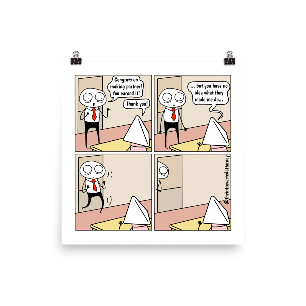Look what they made me do. This comic print makes for a funny congratulations gift for that newly minted law firm partner at the firm.
