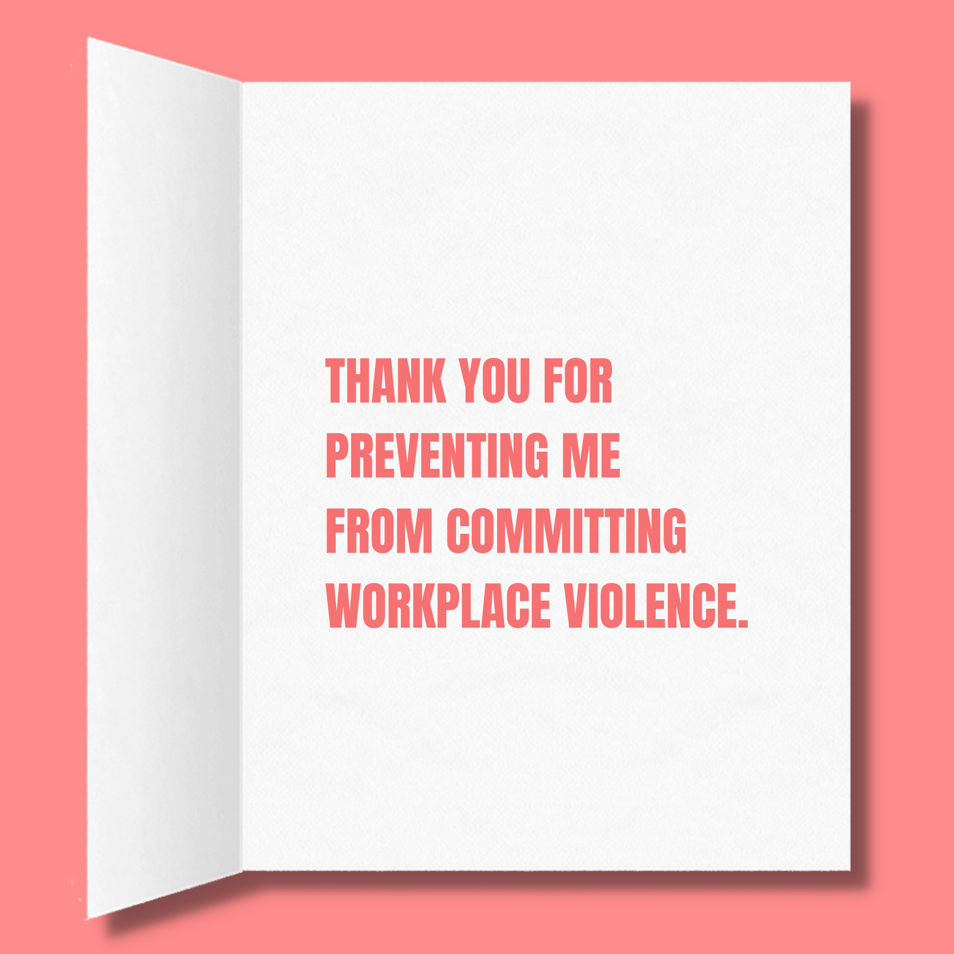 A thank you or platonic Valentine's Day card showing appreciation for your coworker BFF who's the best work wife ever. Your entire office owes her a huge thank you because she has prevented you from committing workplace violence.