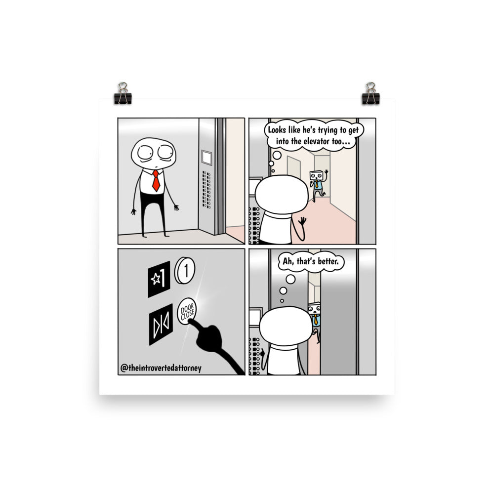 This comic print makes for a funny lawyer gift for that attorney who prefers to ride the elevator in peace without small talk.