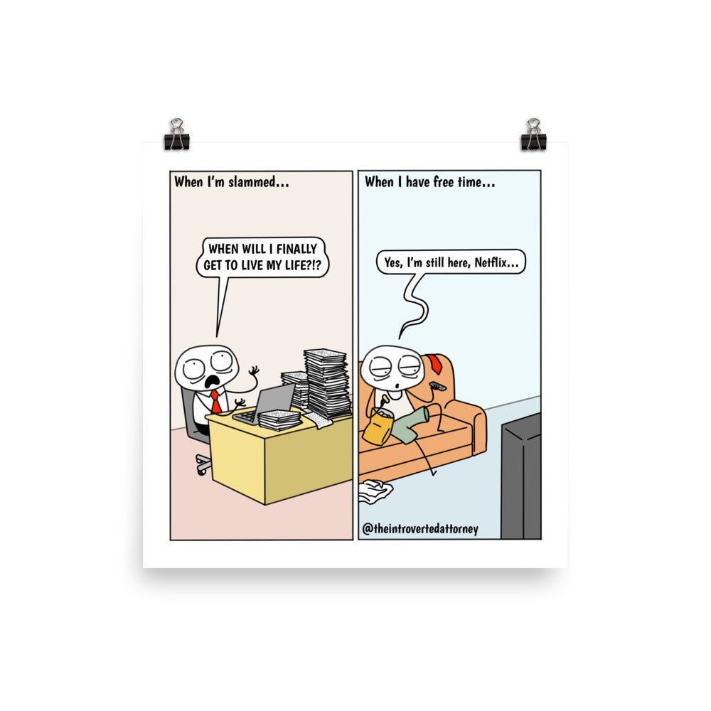 This comic print makes for a funny lawyer gift for that attorney who yearns for free time and then squanders it all on social media and Netflix.