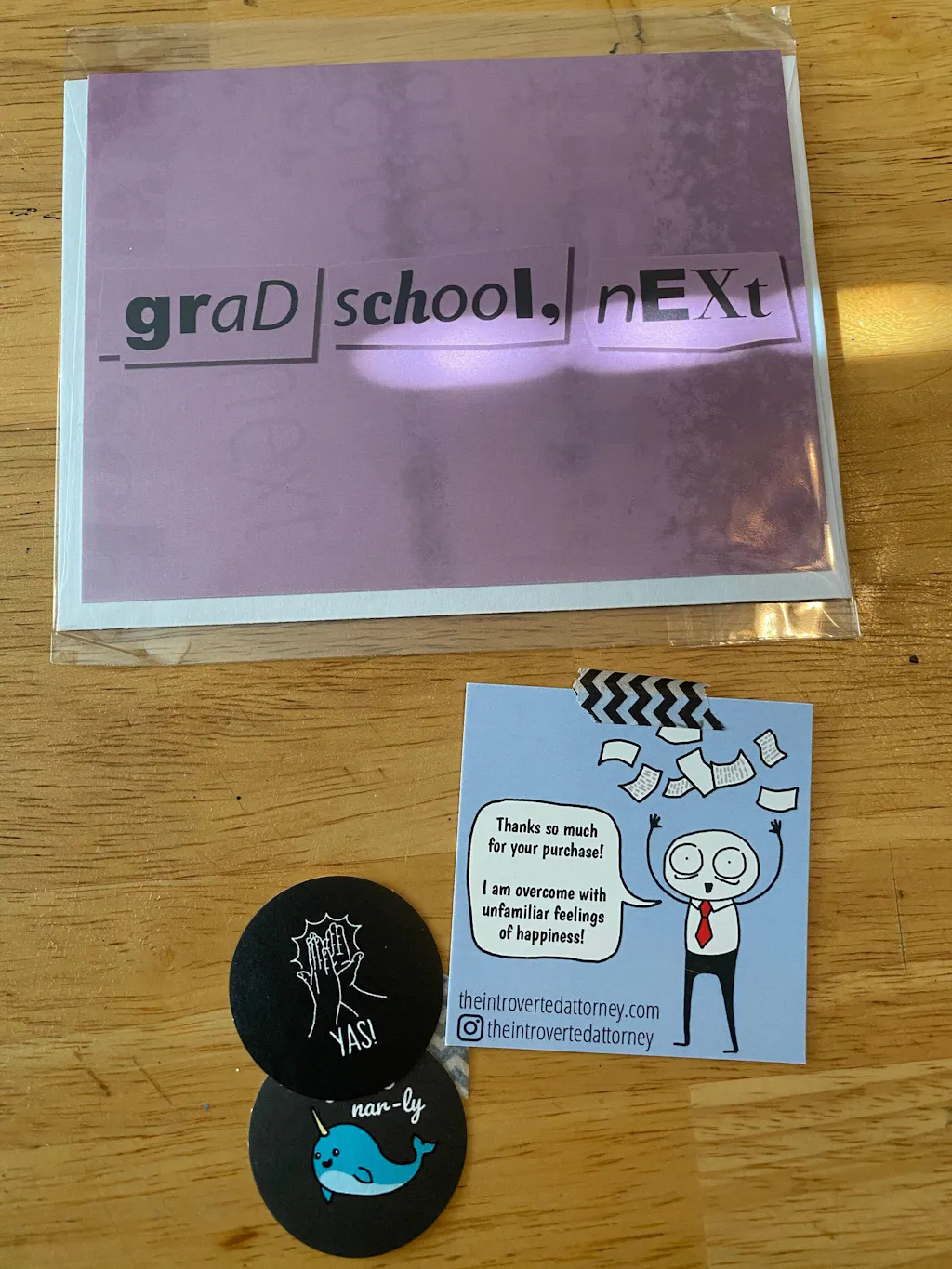 An Ariana Grande-inspired card for the recent graduate school survivor or a congratulations card for a newly accepted graduate school student.