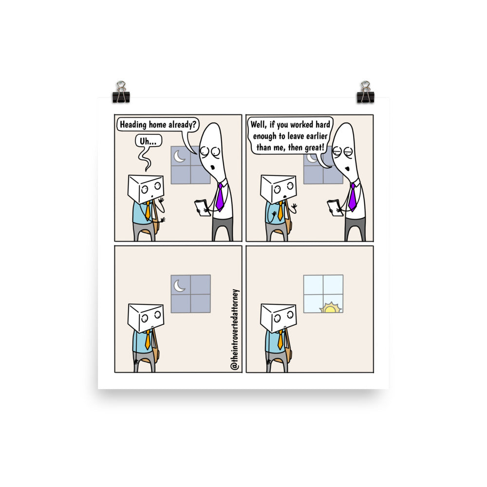 This comic print makes for a funny lawyer gift for that attorney who knows the awkwardness of bumping into a partner when trying to leave the law firm office.