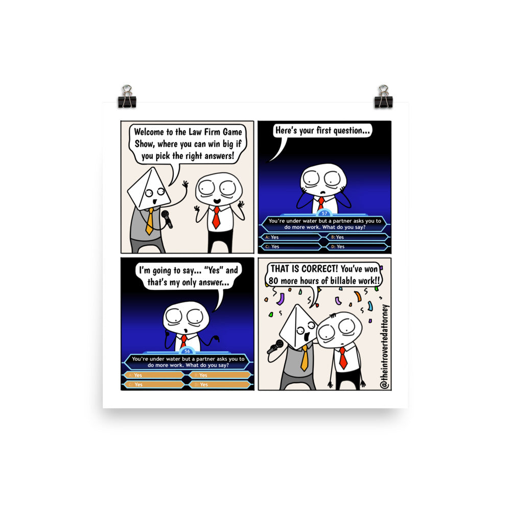 This comic print makes for a funny lawyer gift for that attorney who has played the law firm game of "who wants to bill an insane amount of hours" every day.