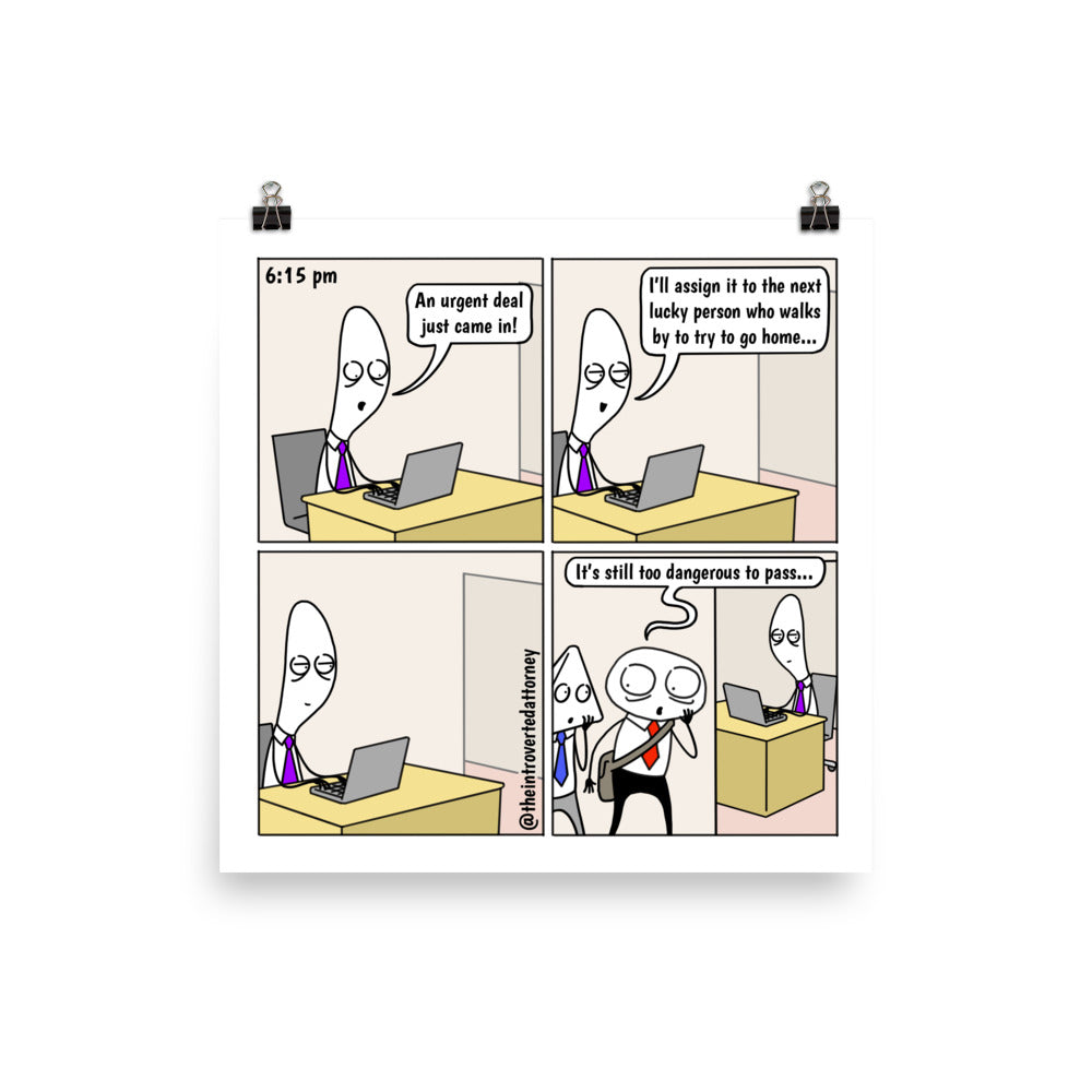 This comic print makes for a funny lawyer gift for that attorney who knows what it's like to be ready to go home but then get assigned an urgent deal before leaving the office.