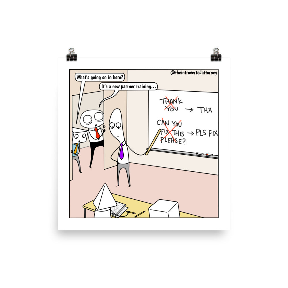 This comic print makes for a funny lawyer gift for that attorney who are familiar with law firm partner abbreviations of "thanks" to "thx".