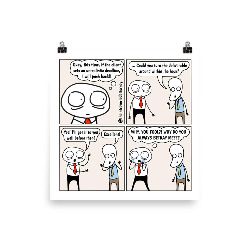 This comic print makes for a funny lawyer gift for that attorney who has to deal with self sabotage when over promising on deadlines.