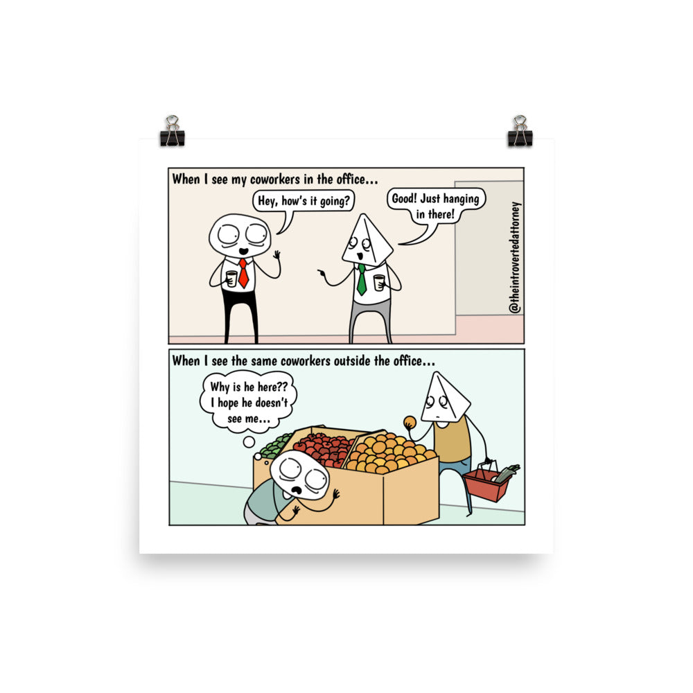This comic print makes for a funny lawyer gift for that attorney who finds it unpleasant to see coworkers outside of the office unexpectedly.