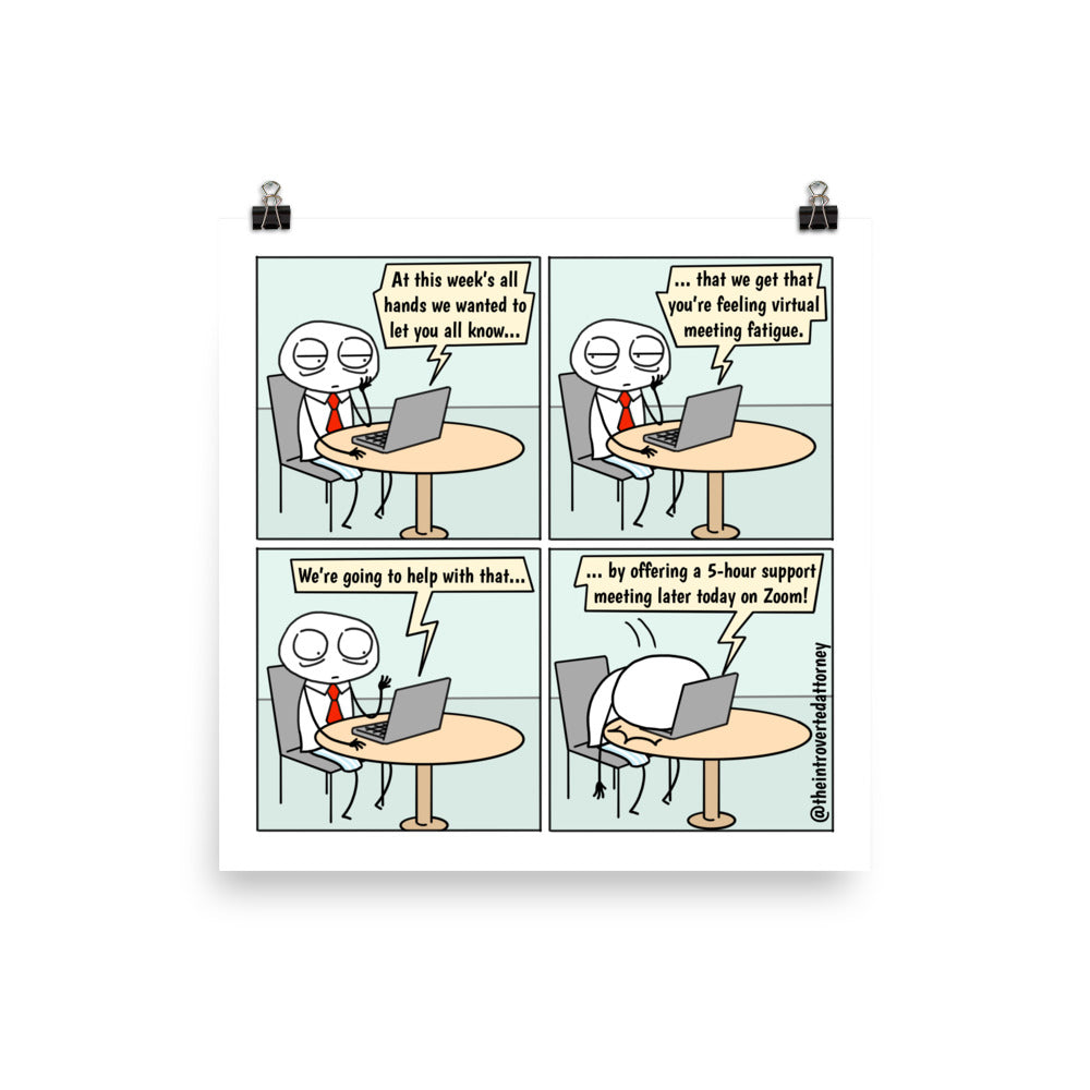 This comic print makes for a funny lawyer gift for that attorney who has suffered from virtual meeting fatigue only to be offered more virtual meetings.