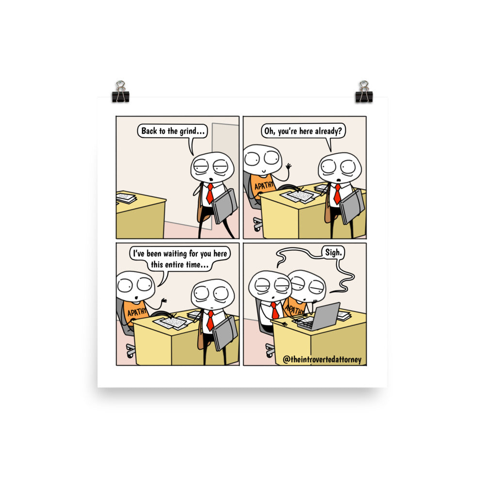 This comic print makes for a funny lawyer gift for that attorney who knows the feeling of returning to work and being overcome with familiar feelings of apathy for work.